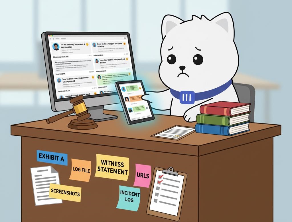 Judges decide on evidence, not impressions. Capture first, then block or report. Full-frame screenshots should show the handle, date, time, and any visible URL. Short screen recordings are useful for videos or live sessions. Save profile links and user IDs, and export message threads where possible. Keep a simple incident log with date, time, platform, handle, the link, what happened, the effect on your life, and what you did next. Consistent, dated entries make it easier to tell a clear story in court.