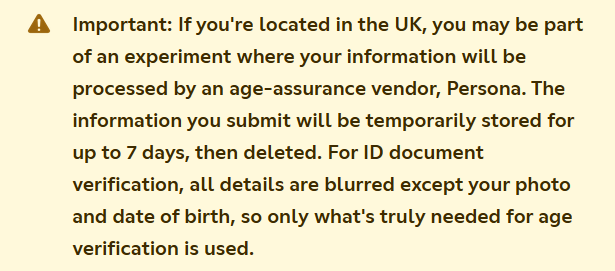 Discord’s own support documentation now includes a disclaimer for UK users stating they “may be part of an experiment where your information will be processed by an age-assurance vendor, Persona.” The notice adds that “the information you submit will be temporarily stored for up to 7 days, then deleted.”