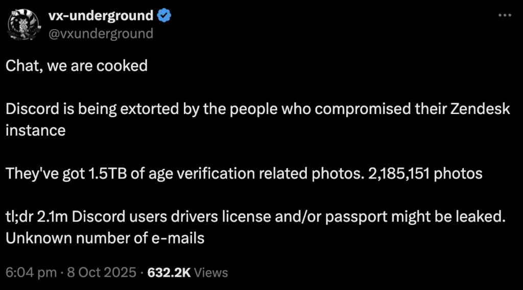 According to Discord’s incident notice, their ticket system (Zendesk) was accessed by a third party, who was able to steal a currently unclear volume of data – including age verification images and ID photos.