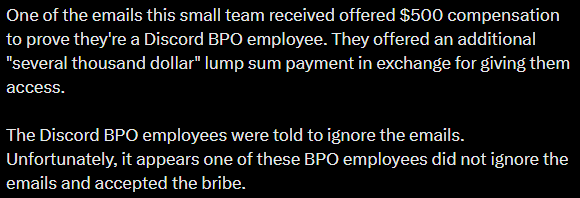 - Discord’s Zendesk instance was breached. VX Underground have reported the threat actor claims to have successfully bribed an offshore team member using Zendesk, responsible for Discord’s Support Channel that handled manual ID verification.
